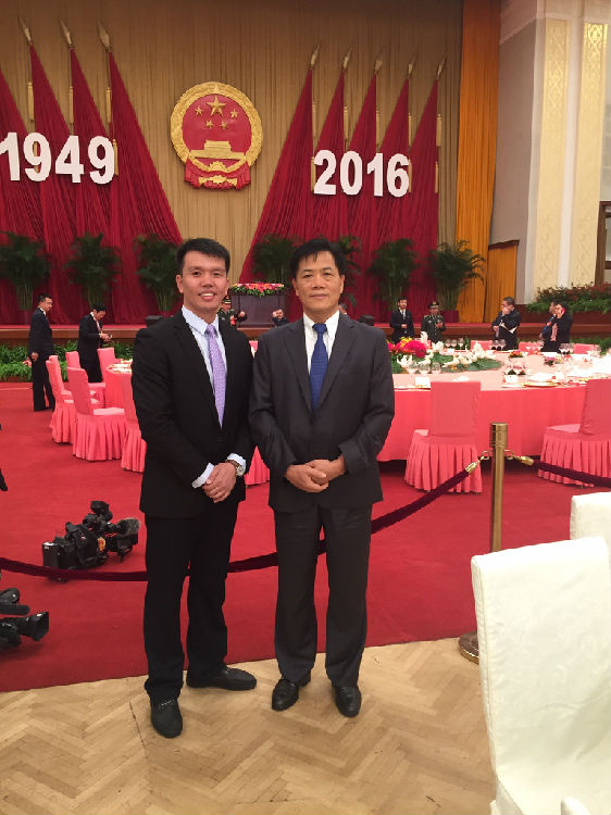 人民大會堂宴會廳燈光璀璨,賓朋歡聚一堂,洋溢著喜慶祥和的氣氛。主席臺上方高懸著莊嚴的國徽,“1949—2016”的大字年號在鮮艷的五星紅旗映襯下熠熠生輝。