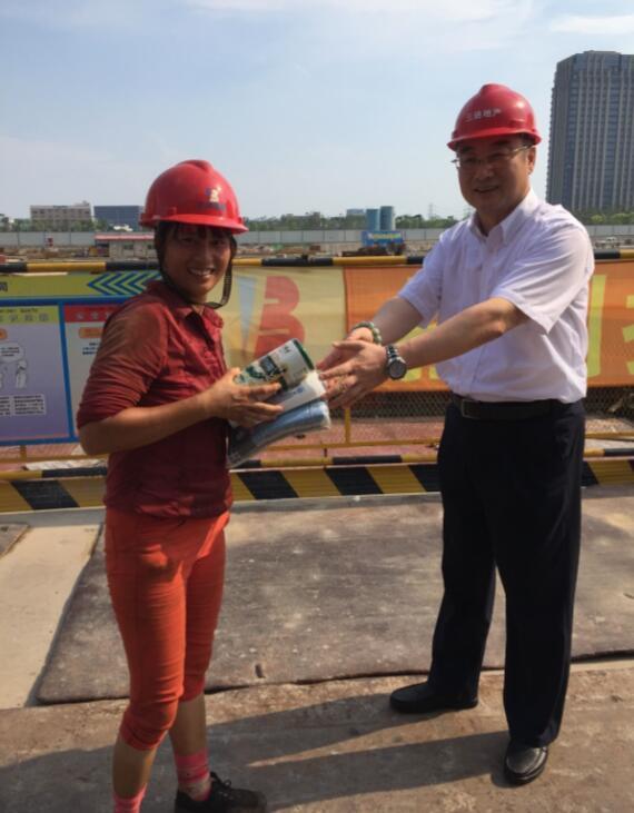 7月20日下午,集團(tuán)副總裁趙魯海、總裁助理郭震航、運(yùn)營(yíng)中心總經(jīng)理兼松江項(xiàng)目總經(jīng)理陳煒及集團(tuán)人力行政中心總經(jīng)理黃衛(wèi)興、成本控制中心吳天義一行下基層慰問(wèn)項(xiàng)目一線員工及施工單位的農(nóng)民工,在工程部門(mén)人員的陪同下,到各工地現(xiàn)場(chǎng)開(kāi)展慰問(wèn)活動(dòng),每位領(lǐng)導(dǎo)都與員工親切握手,并將毛巾、菊花茶、洗護(hù)用品等防暑降溫“大禮包” 一一送到職工的手中,為員工們帶來(lái)了絲絲“清涼”。
