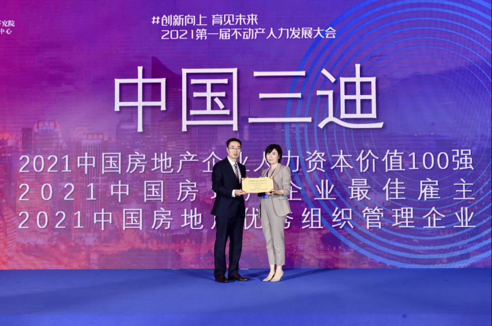 9月23日,2021中國房地產業價值峰會在成都召開,中國三迪憑借強勁的品牌競爭力和經營實力,得益于優秀的組織效能管理、企業文化建設的突出表現,榮獲2021中國房地產企業人力資本價值100強第77位、2021中國房地產企業最佳雇主,2021中國房地產優秀組織管理企業獎等3項大獎,這是繼榮獲2021年度人力資源管理杰出獎之后,行業地位再獲認可,彰顯了業界對中國三迪在企業治理方面的肯定。