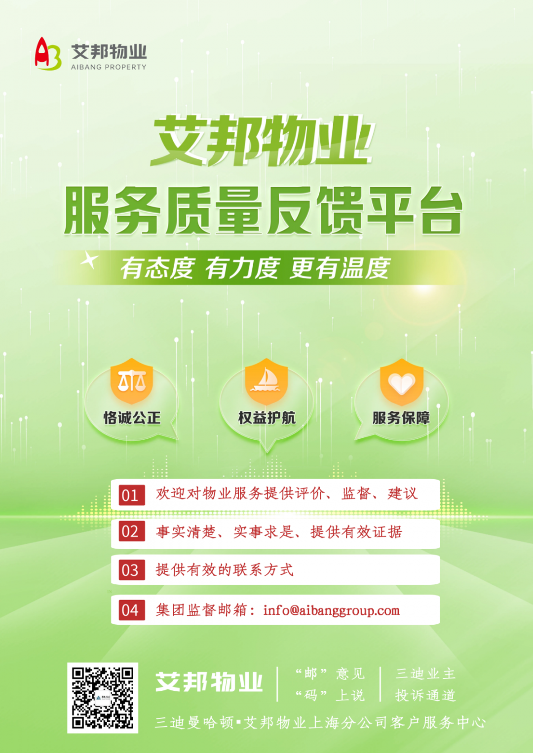 近日,集團發布物業服務評價、反饋、監督郵箱(郵箱:info@aibanggroup.com),由集團總部相關人員負責郵箱管理,要求物業服務部門在收到差評后,按照“誰辦理、誰負責”的原則,由業務辦理單位第一時間啟動程序,安排專人回訪核實。對情況清楚、訴求合理的問題,立行立改;對情況復雜、一時難以解決的,建立臺賬,限期整改;對缺乏合理依據的,做好解釋說明。確保差評件件有整改、有反饋、有記錄,要求實名差評回訪整改率達到100%。