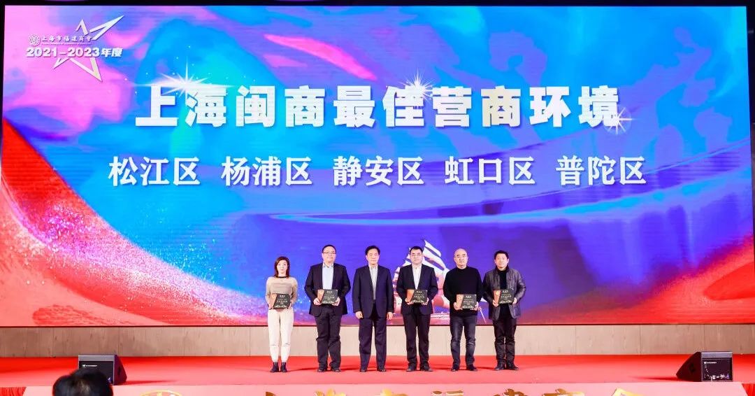 上海市福建商會輪值會長郭加迪為松江區(qū)、楊浦區(qū)、靜安區(qū)、虹口區(qū)、普陀區(qū)頒發(fā)上海閩商最佳營商環(huán)境榮譽牌匾。